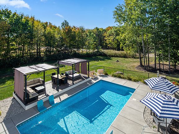 Outdoor poolSport courtSpacious primary suiteDouble-height windowsDramatic great roomSpa-like bathLush tree-lined street