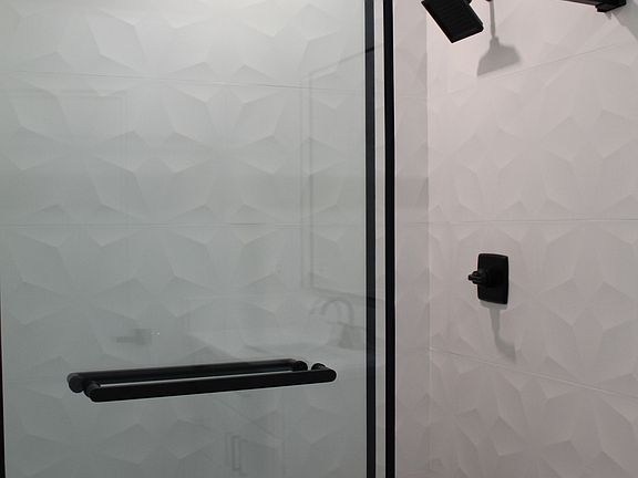 Sleek cabinetryFresh modern feelLarge windowsNatural lightBeautiful walk-in showerHigh ceilingsElegant quartz counters