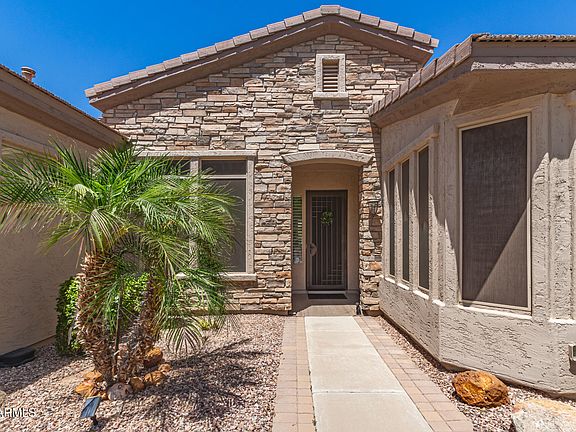 Stunning luxury home in the coveted Active Adult Trilogy community, with all these wonderful features: Beautiful plank style tiled flooring, 6 in. baseboards, plantation shutters, crown molding, 10 ft ceilings and 8 foot interior doors. Two spacious bedrooms plus a den and a front bayed nook. Gourmet kitchen with a plethora of lovely wood cabinetry and private bayed nook in front of it to enhance your living lifestyle. The large primary bedroom features a garden door to the rear patio, a luxurious master bathroom and generous walk in closet. The good sized 2nd bedroom is split from the master and adjacent to the bathroom. The great room is grand and has a favorable flow for entertaining, with a slider to the well maintained fenced rear yard with artificial turf. Active Golf Course Community offers 8 pickleball courts, 3 tennis courts, bocce a heated lap swimming pool, and a resort enjoyment pool + spa. The clubhouse has a library, restaurant, ballroom, art rooms, exercise room and so much more! Convenient to shopping, dining, Costco and Mesa Gateway Airport.