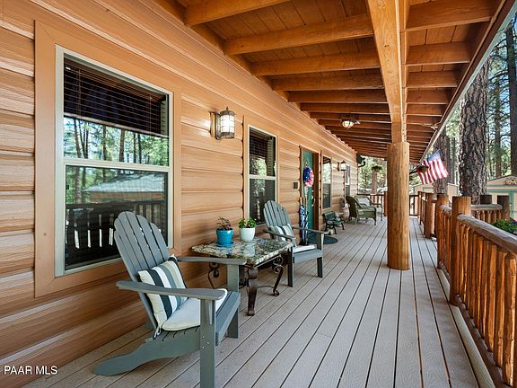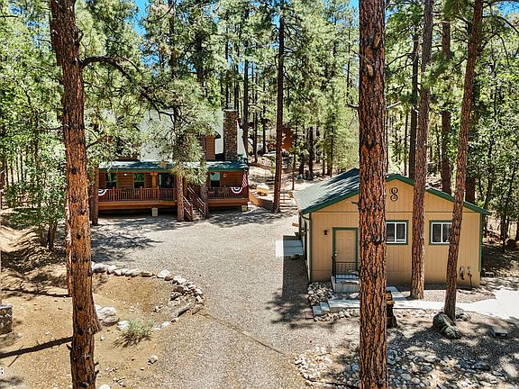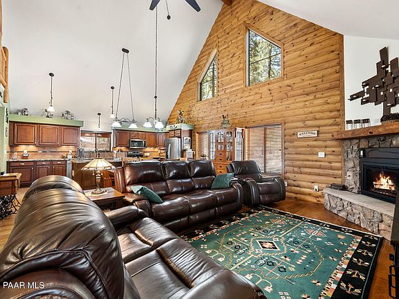 In coveted Groom Creek and minutes from downtown Prescott on a cul-de-sac road in Groom Creek, this steel-sided log-style home offers serenity and style on 0.58+ acres. Vaulted ceilings, wood floors, and a rock gas fireplace anchor the open layout. The granite island kitchen features stainless steel appliances. A small loft adds flexible space, while dormers and large windows bring in light. Outside: covered porch, paver patio with firepit, grassy yard, and towering pines. Bonus: 816 sq ft heated garage/workshop, RV hookups, backup Generac generator, 2 sheds, and durable metal siding. On a paved road -- the ultimate retreat!