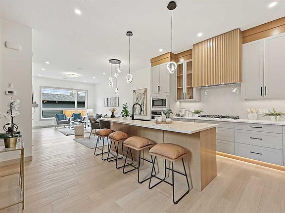 I'm excited to present this brand-new, move-in ready luxury infill with double garage and situated on an oversized 123' deep lot located on a very quiet street in West Bowness. This property boasts elevated design and incredible functionality, featuring a legal 2-bedroom basement suite (subject to city approvals), a convenient front den/office on the main floor and a sunny southwest exposed backyard. Every detail was thoughtfully selected, from the wide-plank modern floors to the curated lighting and premium finishes throughout. Step inside to a bright, open-concept main floor with 10' ceilings, oversized windows and neutral tones that create an airy, inviting vibe. The large front den/office is perfect for anyone who works from home, which flows seamlessly into a designer kitchen featuring modern shaker style cabinetry next to warm wood-toned accent pieces paired with a beautiful feature wall, quartz countertops, matte black hardware, a full-height herringbone backsplash, under cabinet lighting, and a perfect-sized center island with bar seating with more natural wood tones, bringing everything together beautifully. The upgraded stainless steel appliance package includes a fridge with french doors, bottom freezer plus ice / water dispenser on the outside, a gas cooktop with stylish hoodfan, and a thoughtfully placed wall oven and microwave. The well-lit, spacious living room features additional built-in shelving and cabinetry plus a cozy gas fireplace with tile surround and custom mantle, and which leads you out to the rear west facing yard, perfect for end of the day BBQ's and lounging in the sun. A mudroom with built-ins including bench seating and a sleek powder room that comes with tile flooring, a back-lit mirror and under vanity lighting complete the mainfloor. Upstairs contains the three large bedrooms, including the primary bedroom which is a true retreat that features a stand-out feature wall and bedside lighting, trayed ceiling, a large walk-in closet with several custom built-ins plus a hotel like ensuite. Enjoy dual sinks, quartz countertops, huge skylight, under vanity lighting, plus a free standing soaker tub and an oversized glass shower with rain shower head. The upper laundry room comes with a quartz countertop for folding and additional wood toned cabinetry, and is situated right across from the stylish full bathroom which features a tiled tub/shower combo. Downstairs features the thoughtfully designed legal 2 bedroom suite (subject to city approvals) and features 9' ceilings, luxury vinyl plank flooring, wonderfully warm toned cabinetry, stainless steel appliances and lots of pot lighting. A full bathroom with elegant tile is also featured plus a dedicated laundry room, separate side entrance and storage, making this perfect for rental income or multigenerational families. Additional features include roughed in A/C & each room wired for Cat 6 data. This is truly an exceptional build. Interior Photos are from next door that's staged 4625 84 ST NW