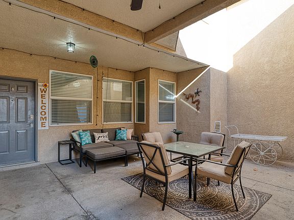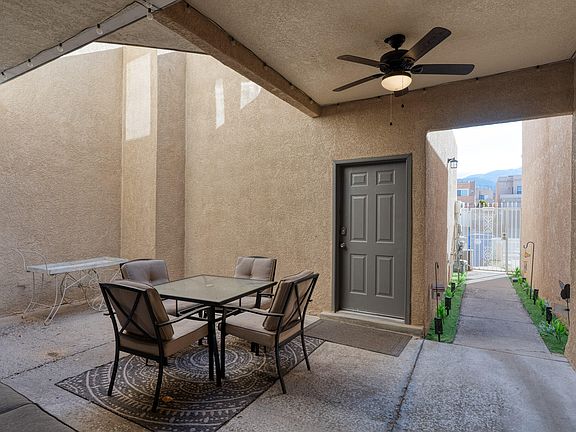 Beautifully maintained townhome in desirable Far NE Heights right by CNM Montoya Campus! This gem is oozing with lovely updates and well cared for details. Enjoy the haven of a completely private courtyard! Inside is a cozy upgraded electric fireplace, bright living room, dining room and beautiful kitchen w granite tops, deep stainless sink and great appliances. Large primary suite w separate jet tub and shower and offers a balcony with mountain views! Half bath downstairs off the LR! 2 car garage! NO HOA! EcoWater system conveys. Refrigerator and W/D do not convey. Move in ready!