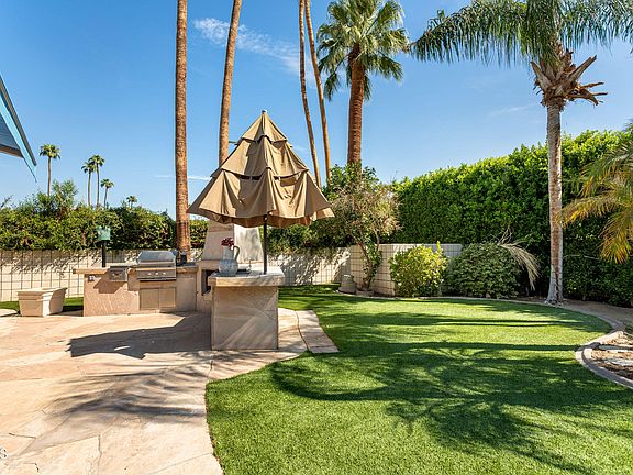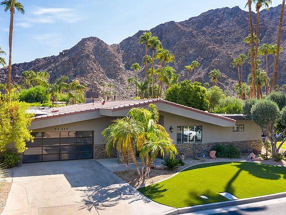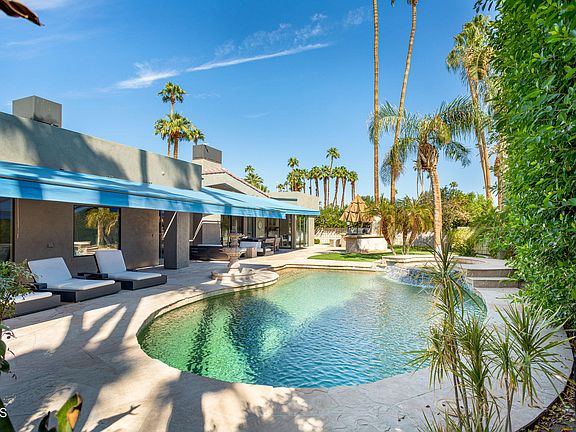 Set within the Indian Wells Country Club community of Manitou Springs, this home has been richly upgraded to showcase its airy indoor/outdoor style. As the open plan moves across cool porcelain floors from a vault-ceilinged Great Room with fireplace to dining room and kitchen, a house-wide sweep of floor to ceiling windows brings nature in. Step outside through the sliding glass doors to the large pool and spa area with cascading waterfalls. A true entertainers dream situated with a BBQ island, refreshing misters, fireplace and automatic sunshades across the back of the house. The gourmet kitchen has been updated with white cabinets, granite counters, two wine coolers and dual dishwashers. All three en suite baths have been remodeled with quartz, granite and marble. In the primary suite, a see-through fireplace serves both bedroom and the beautifully remodeled spa bath. The piece de resistance is the large patio area, shaded by citrus and palms and defined by jaw-dropping closeup views of the Santa Rosa Mountains. Moments from the community greenbelt, driving range and the country club, this is the ideal in desert living.