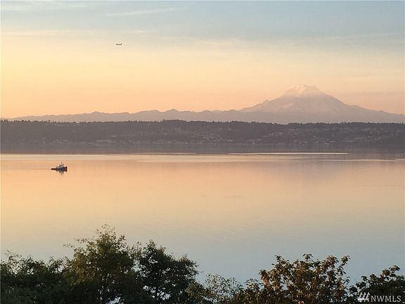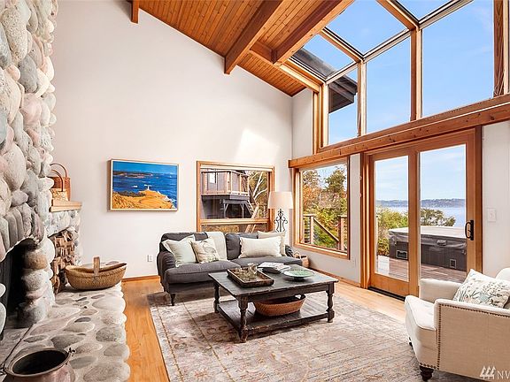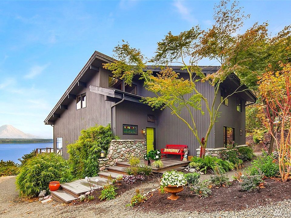 Stunning Mt. Rainier and sound view, 230 ft waterfront, custom NW Contemp lodge home. Soaring river rock FP & floor-ceiling windows frame the view in the LR opening to decks for entertaining. Lg custom kitchen w/ SS appliances open to dining room and decks. Comfortable family room for lounging. Master suite w/Mt and sound views and vaulted ceilings for all day light. Two add'l Br and full bath upstairs. Grounds incl. 3 car garage w/ 600SF above. Garden, landscaping. Shared trail to beach. 3 lots