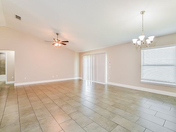 This renovated, 1,806-square-foot rental home in Kissimmee has four bedrooms and two bathrooms. You'll love the open layout and vaulted ceiling in the common areas. The living room and dining room both have tile flooring, with the living room having a sliding glass door and a ceiling fan. A chandelier hangs from the ceiling in the dining room and anchors the space. In the kitchen, you'll find beautiful countertops, a pantry, white cabinetry, and stainless steel appliances. The main bedroom sits on the opposite side of the house from the other bedrooms. It features a walk-in closet and en suite bathroom with a lovely tub, walk-in shower, and double vanity. This room also has two large windows. Contact us for a tour.
