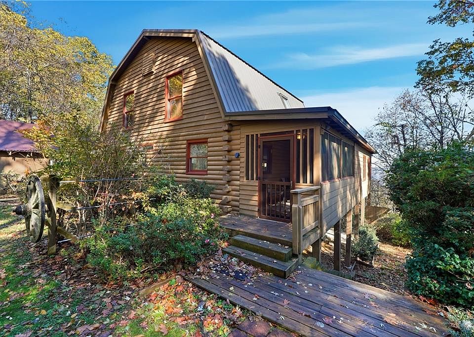 Authentic log cabinsPrimary suite loftNice level yardLevel yardShed and gazeboLong-range viewsScreened front porch