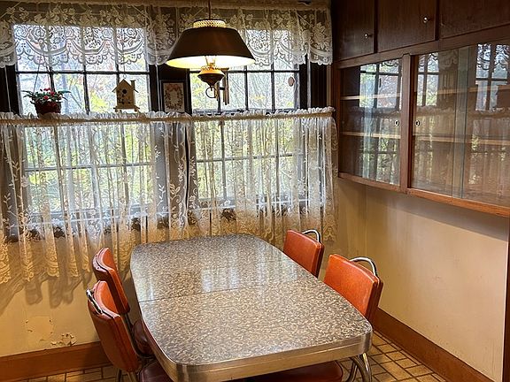 Brick tudorSunlit breakfast nookAdjacent formal dining roomBeautiful wood-trimmed staircase