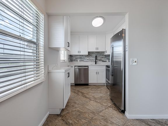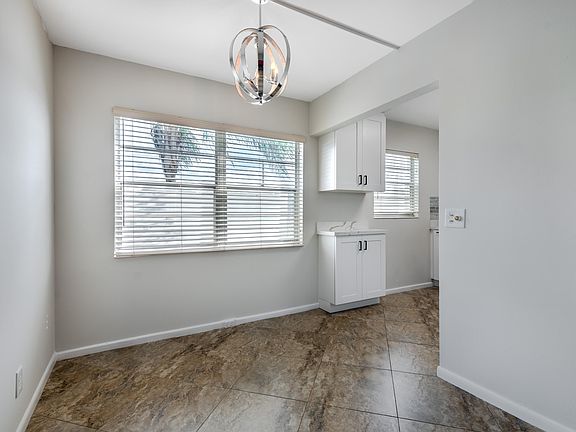 Enjoy this completely renovated condo, new white shaker kitchen, quartz countertops, newer stainless appliances. Tile throughout living areas, vinyl plank in bedrooms and bathrooms. New bathroom cabinets, new toilets, new lighting. The most conveniently located unit a few yards from the allocated parking space - parking right ayt your door. Sit on the tiled patio and enjoy the green space with a view of the lake in the distance. Central AC. Century Village is a paradise, clubhouse features indoor pool, huge gym, theater, ballroom and so much more. Tennis and pickleball courts. You will love living here. Water cable and Internet included by association. We believe the 2 glass sliding doors are impact. Monthly COA fee is $433.60 and Monthly recreation lease 301.79