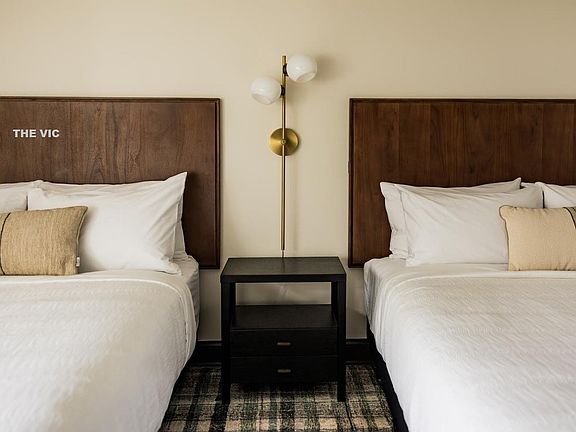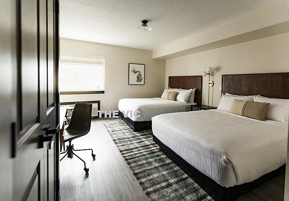 Studios at the Vic: King and Double Queen studio rooms, December to May Off Season Monthly Studio room rentals. Experience The Vic, where modern comfort meets rustic charm just steps from Grand Traverse Bay and minutes from NMC, downtown's shops, restaurants, and breweries. Our beautifully renovated building offers thoughtfully designed rooms, one complimentary parking space per unit, a fitness center, community room, and a laundry room. 24/7 guest support by text, on-site and virtual Front Desk services. Single King and Double Queen rooms available. In room microwave and mini-fridge, with available hot plate. Clean towels and sheets weekly with light cleaning included in Utility fee.