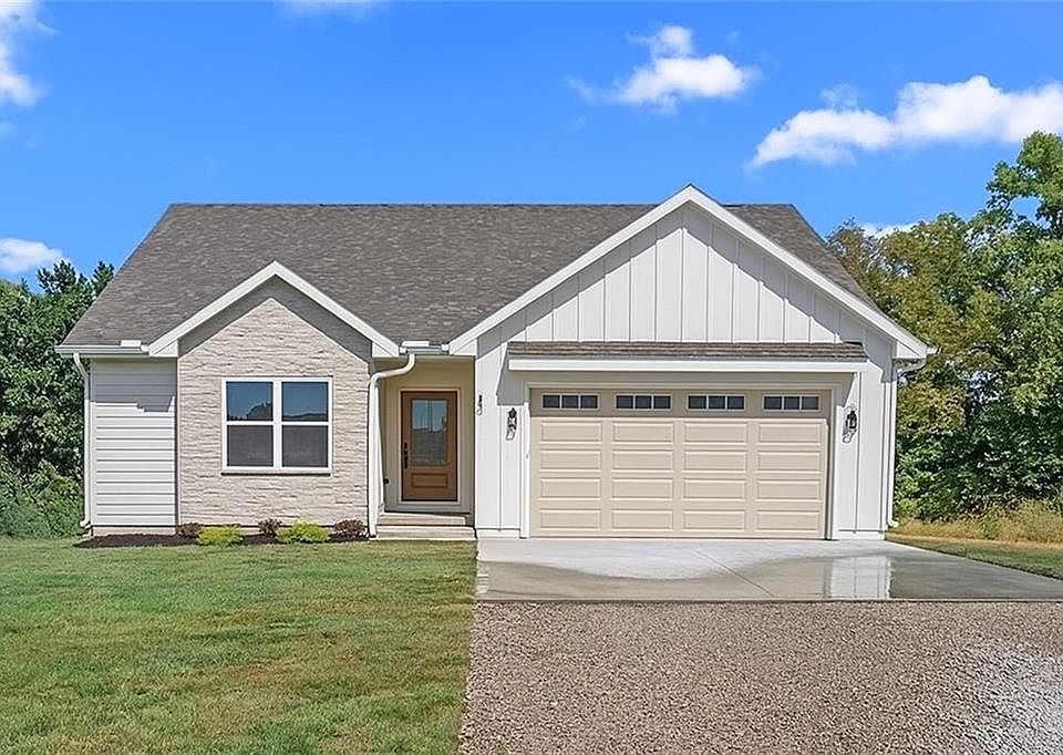 Discover the perfect blend of modern luxury and serene living in this stunning new construction home, ideally located for easy access to Whiteman Air Force Base and Warrensburg. This spacious 4-bedroom, 3-bath residence boasts an expansive open-concept design, where every detail has been thoughtfully curated for contemporary living. The heart of the home is the kitchen, featuring gleaming quartz countertops, sleek stainless steel appliances, and an extra-large island with seating for five – perfect for lively gatherings or casual meals. The living room offers a cozy ambiance with an elegant electric fireplace and mantel, setting the stage for relaxation. Throughout the entire home, durable and stylish LVP flooring ensures beauty and easy maintenance. Three generous bedrooms, including the tranquil primary suite, are conveniently located on the main level, alongside a dedicated main-level laundry room. The partially finished walk-out basement offers incredible additional living space, featuring a large family room, ample storage, a fourth private bedroom, and a full bathroom, ideal for guests, a home office, or extended family. Step outside to an extra-large lot that backs directly to peaceful green space, providing privacy and beautiful views. Enjoy outdoor living on the spacious deck, or utilize the patio beneath, perfect for entertaining.
