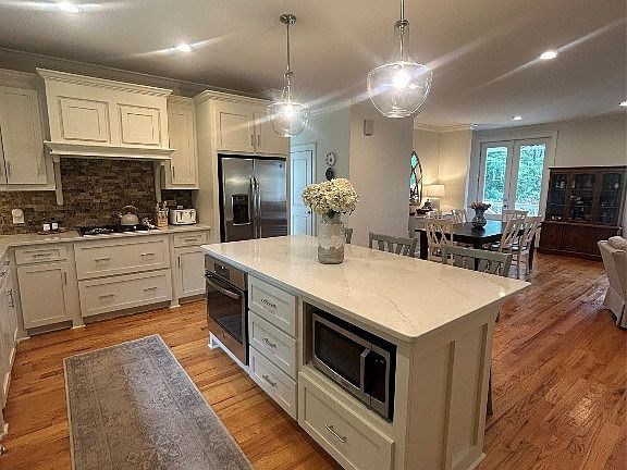 As you step inside, the spacious great room is a true showstopper, featuring a cozy gas log fireplace and three striking French doors that open onto a spacious front porch, perfect for both lively gatherings and quiet evenings in.