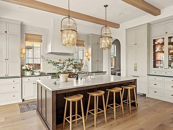 Truly one-of-a-kind, this fully custom designer’s personal residence by Shaddock Custom Homes is tucked within Prosper’s prestigious Peninsula at Windsong Ranch. Showcasing timeless design, curated finishes, and thoughtful functionality—including a private in-law suite and 4-car garage with EV outlets—this home is widely regarded as one of the community’s most admired. The modern traditional exterior is defined by copper gutters and awnings, Coppersmith gas lanterns, and professional landscaping. Inside, every detail has been crafted for enduring elegance with wide-plank white oak floors and beams, tongue-and-groove millwork and ceilings, custom built-ins, solid-core doors with Emtek brass hardware, designer lighting from Visual Comfort, wallpapers by Schumacher and Kelly Ventura, Regina Andrew mirrors, and Perrin & Rowe and Kohler fixtures throughout. At the heart of the home, the showpiece kitchen features a china hutch, appliance garages, and a working pantry, all outfitted in custom rift-sawn white oak inset cabinetry with soft-close hinges, paneled fridge and dishwasher, quartz countertops, hand-made Riad Ziliage backsplash, plaster range hood, Villeroy & Boch farmhouse sink, and Thermador appliances. Smart home amenities include Lutron dimmers, automated Hunter Douglas Powerview shades, and a whole-house water filtration and conditioning system. The primary suite boasts a cathedral vaulted tongue-and-groove ceiling with beam detail, Belgian linen window treatments, a spa-worthy marble bath with Brizo fixtures, and a custom closet. The private in-law apartment is fully integrated yet self-contained, offering its own exterior entrance, Bosch appliances, paneled fridge-freezer, washer-dryer hookups, full soundproofing, thermostat control, and a luxurious bath with walk in shower. Slider doors open to the covered patio with Coyote grill, fridge, trash pullout, quartz counters and electric screen—perfect for year-round entertaining.