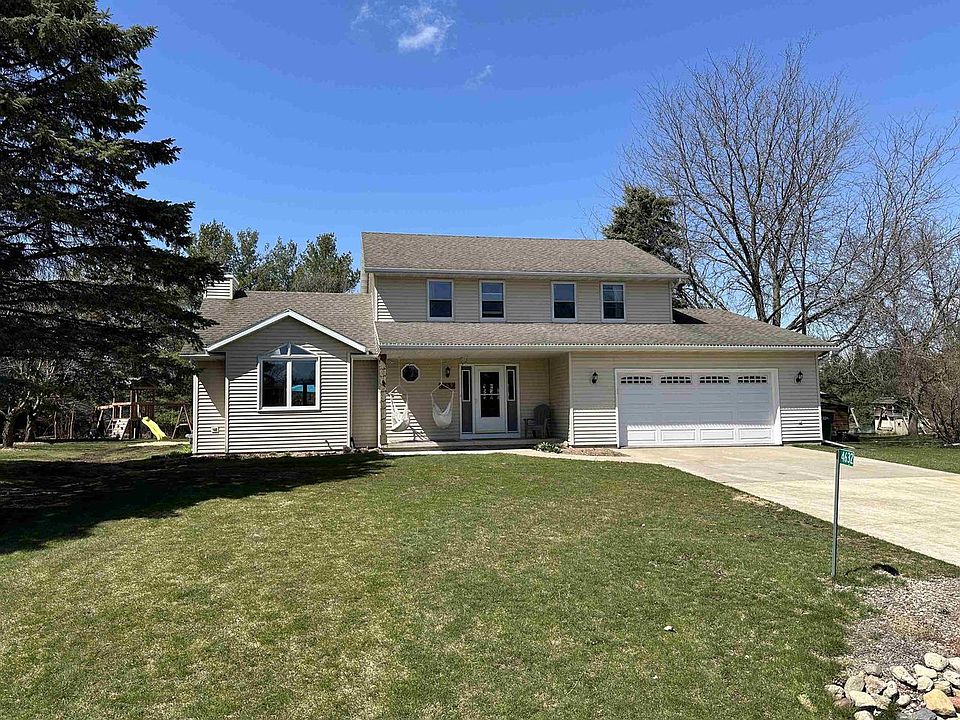 VPR $499,900-524,900.This 2-story home blends modern elegance with timeless charm on .60 acre mature lot in rural subdivision. Step into the spacious living rm adorned w/ a wood-burning fireplace boasting the beautiful surround. Natural light pours in through the skylights, illuminating the vaulted ceilings, hardwood flrs & built-in window seat. The heart of the home lies in the expansive kitchen, featuring granite counters, ample cabinetry, & a breakfast bar. Adjacent to the kitchen, the dining room, access to deck/yard/patio, along w/ laundry & powder rm. Work from home effortlessly in the ML office. Primary suite boasts a serene sanctuary complete w/ a dual vanity & full bath. Don't forget the partially finished ll, heated 3 car tandem garage + attic storage, new backyard patio & more.