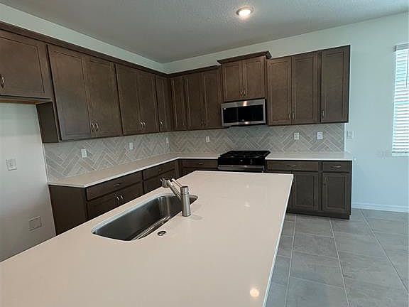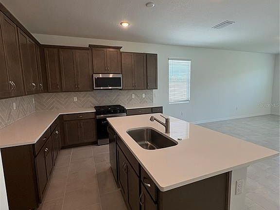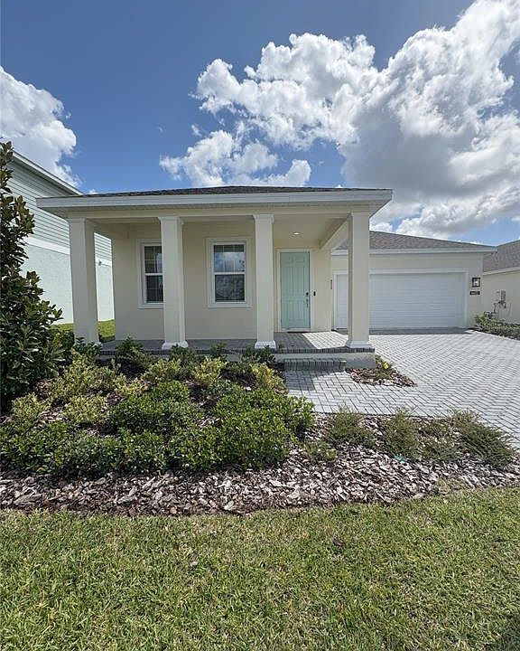 Welcome to the beautifully designed Myrtle plan—a charming new home that exudes comfort and style, starting with a welcoming front porch and continuing through its thoughtfully crafted open-concept layout. With soaring 9'4" ceilings, this 3-bedroom, 2-bath home features a spacious Great Room that opens to a covered rear lanai, perfect for indoor-outdoor living. The well-appointed kitchen boasts 42" upper cabinets with crown molding, quartz countertops, a sleek tile backsplash, stainless steel appliances, and a center island ideal for entertaining. Elegant tile flooring enhances the main living areas, while window blinds throughout add both privacy and convenience. The luxurious Primary Suite offers a generous walk-in closet and a beautiful en-suite bath with dual sinks, quartz countertops, linen closet, and walk-in shower with upgraded wall tile surround. A 2-car garage and brick paver driveway and lead walk complete the polished exterior of this must-see home. Outstanding Community amenities include covered Playground and walking trails featuring outdoor exercise equipment, with future amenities to include pool and cabana. Oakview is conveniently located just 1 mile from SR 429 for easy commuting, and only 11 miles from Wekiwa Springs State Park and 12 minutes from Lake Apopka. Additionally, the Community is close to the upcoming new Wyld Oaks development featuring a 3 acre medical campus and extensive retail spaces.