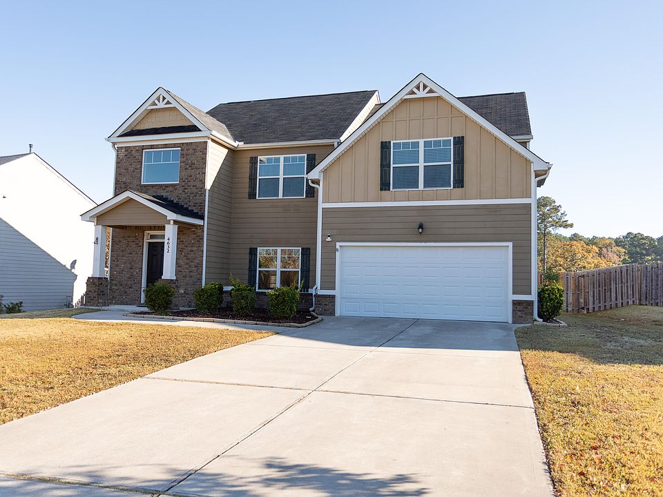 AVAILABLE HOME FOR LEASE NOW -Gorgeous Craftsman style, two-story home features 5 bedrooms, 3 bathrooms, 2,736 sqft, an open concept floor plan, and updated LVP flooring downstairs, NEW CARPET installed throughout. Granite countertops in the kitchen, stainless appliances (dishwasher, built in microwave, and a GAS stove. Great room w/fireplace. Main level bedroom w/full bath. The yard features an extended back patio, and is on a .37 acre lot that backs up to green space!