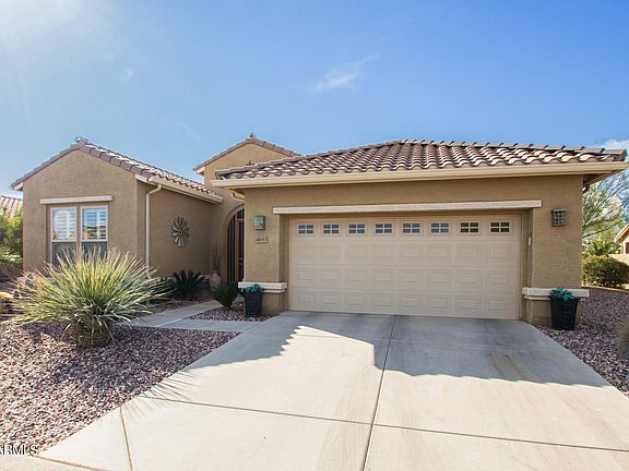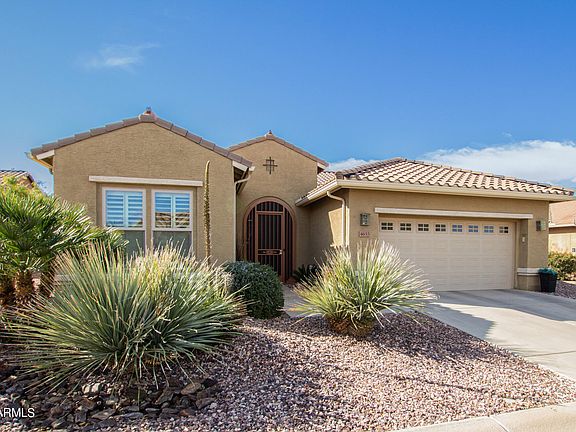 GORGEOUS block home! Furnished. Shows like a model on oversized premium lot with view fencing, located in highly desirable area of Robson Ranch. 2 bedroom,2.5 bath, den & 4ft garage ext. Kitchen features Cape Cod style cabinets w/3'' crown molding, soft close dovetail drawers, built in trash bin, cast iron sink, granite countertops, tile backsplash & Stainless appliances. RO system, pull outs. This home has so many upgrades from the 4 1/4'' baseboards, 2-tone paint, bay window in dining, speakers in GR & patio,18 x 18'' tiles, rain gutters, comfort height toilets, upgraded lights, fans plumbing & hardware fixtures. Garage has 4 ft ext., service door & utility sink. Wall to hide trash can. Step out back to the professionally landscaped backyard with lots of pavers and view fencing. Beautiful patio is stubbed for gas. Two new electric patio screens on east side. Two mature fruit trees, grapefruit and tangelo. Sun shades, under cabinet lighting in the kitchen. Solatube near front door. Best part of this home are the beautiful sunsets from your backyard or from the kitchen. Most furnishings included.