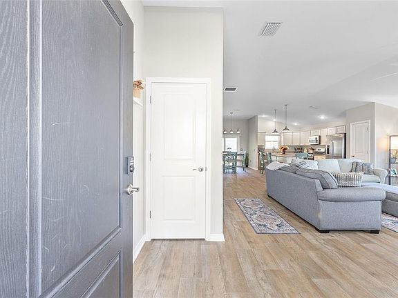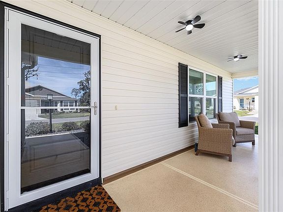 Welcome to this charming Cottage-Series Hammock model located in The Villages, offering fantastic natural light, cathedral ceilings, and an inviting open floor plan. The kitchen features a convenient breakfast bar, GAS range, white cabinetry, stainless steel appliances, and a closet pantry for efficient storage. The spacious primary suite includes a walk-in closet, dual sinks, and a large step-in shower. Two additional bedrooms provide ideal flexibility for guests, a home office, crafts, or hobbies. You'll love the decorative painted driveway and screen-enclosed lanai, perfect for relaxing or entertaining. Enjoy peaceful mornings on the covered front porch with a cozy seating area. Additional highlights include an indoor laundry room with sink, 2-car garage, and a whole-house water softener for crisp, clean water. Located close to shopping, restaurants, and medical services—plus all the incredible RESORT-STYLE AMENITIES The Villages is famous for. Furnishings available separately.