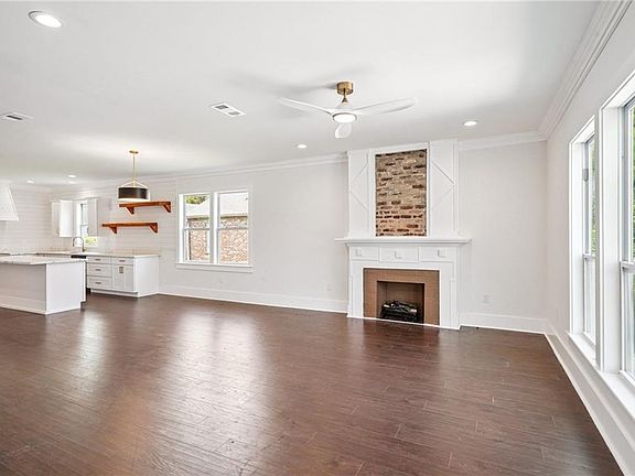 Inside, you're greeted by an open and airy living space featuring abundant natural light, elegant crown molding, and rich hardwood floors. The spacious living area centers around a striking brick-accented fireplace and flows seamlessly into the chef’s kitchen, designed with quartz countertops, a large island, custom cabinetry, and modern open shelving.