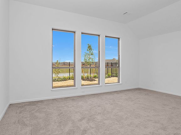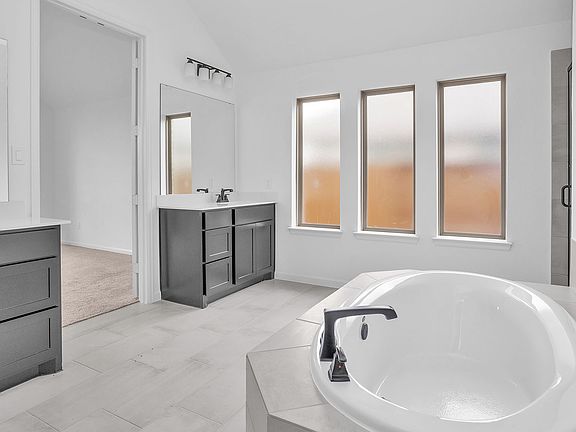 Extended entry with 13-foot ceiling leads to open kitchen, dining area and family room. Kitchen offers generous counter space, corner walk-in pantry and inviting island with built-in seating space. Dining area flows into family room with a wood mantel fireplace and wall of windows. Game room with French doors just across from kitchen. Primary suite includes double-door entry to primary bath with dual vanities, garden tub, separate glass-enclosed shower and two large walk-in closets. Secondary bedrooms feature walk-in closets. Extended covered backyard patio. Mud room off two-car garage. Representative Images. Features and specifications may vary by community.