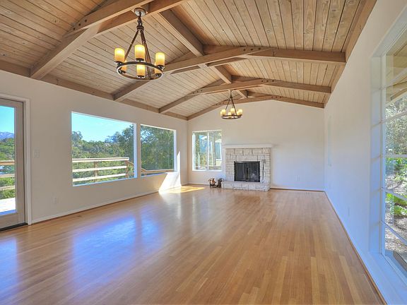 Serene Hope Ranch, mountain view home on 2.52 peaceful acres lined with fruit bearing avocado & fruit trees in the exclusive Hope Ranch HOA. Fantastic 3 BR 2 bath nestled beautifully overlooking the tranquil canyon greenbelt. Show stopping mountain & valley views for miles second only to the amazing star gazing opportunities throughout. Ranch living at its best cozied up next to the wood burning fireplace surrounded by hard wood floors and high ceilings. Newly remodeled custom kitchen featuring Wolf Gourmet appliances and dining area. Primary bedroom features a walk-in closet and enough room to include a sitting area. Home amenities include soft-water system and outdoor shower, perfect for rinsing off after a long day at the private beach before slipping into your own hot tub. Lower level features separate entrance creating the perfect office or mother-in-law suite with ample light. Both levels feature large French doors welcoming you into the garden and deck area. Ample storage throughout including a two car garage with washer/dryer hook-ups.
