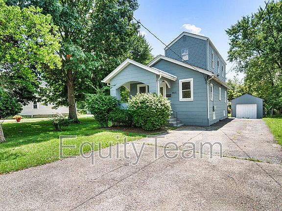 This home features: Fresh paint throughout; hardwood flooring; fully updated kitchen with new cabinets, quartz countertops, tile backsplash, and SS appliances. It also features the primary bedroom on the first floor; two fully updated bathrooms; a full basement; and a large detached garage for extra storage, with a washer and dryer included. It also includes a covered front porch, back patio, fenced backyard, large driveway, and more!