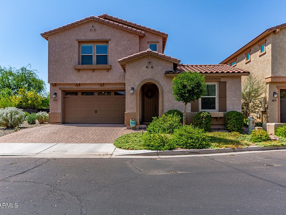 An exceptional home privately nestled within the gated community of The Sanctuary at Desert Ridge. Situated on a rare oversized lot with only one neighbor and a serene greenbelt next door, this residence offers privacy, charm, and thoughtful design at every turn. Meticulously maintained, every detail has been carefully considered with designer finishes throughout. Featuring 3 bedrooms & 3 bathroom, this home includes a convenient bedroom and full bath on the first floor perfect for guests or multigenerational living. The heart of the home is a stunning kitchen with granite countertops, stainless steel appliances, and ample cabinetry, opening seamlessly into the living and dining areas. Designed for Arizona living, the protected outdoor space allows for year round indoor/outdoor enjoyment. Enjoy two private outdoor living areas one designed for entertaining around the cozy firepit, and another tucked away for complete serenity and relaxation. Low-maintenance landscaping ensures more time to savor Arizona nights in comfort. Or take a short stroll to the state of the art community clubhouse where you'll find endless opportunities to connect and unwind. Residents enjoy peaceful walking paths, a heated pool, shaded ramadas, and playgrounds.