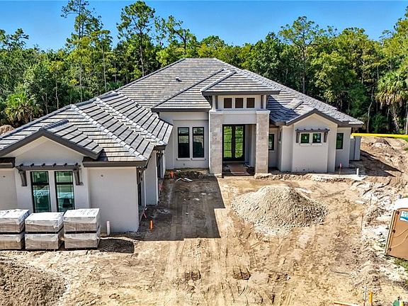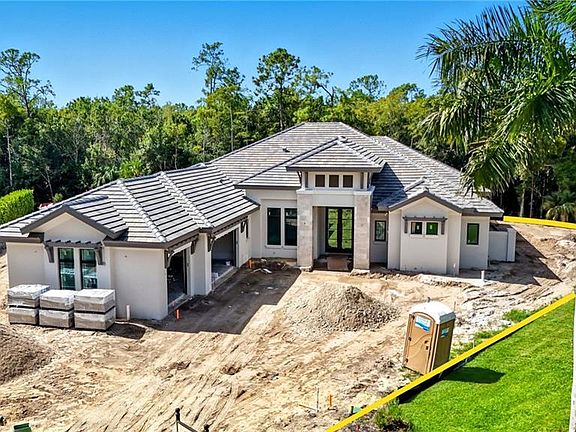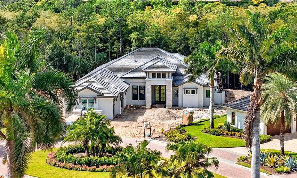Introducing a masterpiece by Florida Lifestyle Homes in Quail West—one of Naples’ most prestigious golf course communities. This new construction residence blends timeless architecture with modern sophistication, crafted with meticulous attention to every detail. Step inside and be captivated by the expansive open floor plan, highlighted by stunning coffered ceilings with oak beams, ambient accent lighting, and elegant crown moulding. The state-of-the-art gourmet kitchen features Thermador appliances, a butler’s pantry, and designer finishes, perfect for culinary enthusiasts and entertainers alike. Each ensuite bedroom offers a private retreat with walk-in closets, while the split floor plan ensures both comfort and privacy. Additional interior highlights include wood flooring, art niches, custom moulding accents, and designer lighting throughout. The primary suite is a sanctuary of sophistication, showcasing intricate wall and ceiling treatments, dual walk-in closets, and a spa-inspired bath with two water closets, a dramatic back-lit feature wall, a soaking tub, and a luxurious pass-through shower. Transition seamlessly to the screened outdoor oasis, where expansive covered lanais with tongue-and-groove tray ceilings, recessed lighting, and a fully equipped outdoor kitchen set the stage for unforgettable gatherings. Relax by the fireplace or unwind in the designer pool and sunken spa with spillover and waterfall features. A 500-gallon buried propane tank powers the kitchen, fireplace, spa, and tankless water heater, ensuring both performance and efficiency. Perfectly situated on a wide, pie-shaped cul-de-sac lot with coveted southwest exposure, the home offers both privacy and breathtaking sunset views. Quail West residents enjoy access to two Arthur Hills-designed championship golf courses, a spectacular clubhouse with multiple dining venues, and world-class tennis and pickleball facilities. Adding to the value, this residence is offered with a Social Membership included ($100,000 value), granting you immediate access to Quail West’s vibrant lifestyle and exclusive amenities. Completion is anticipated in late November, with a full builder warranty and comprehensive buyer walk-through upon delivery. This is more than a home—it is a statement of elegance, privacy, and prestige.
