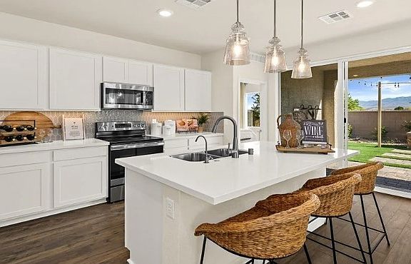 What's Special: Golf Course View | Corner Lot | Mountain View | Covered Patio | Best Seller. New Construction – December Completion! Built by America's Most Trusted Homebuilder. Welcome to the Daffodil at 4638 Cactus Canyon Drive in Ovation at Mountain Falls! This thoughtfully designed home offers 1,295 sq. ft. with 2 bedrooms, 2 baths, and a 2-car garage. Step inside and discover a welcoming foyer that leads to a private guest wing with a bedroom and full bath. The heart of the home features an open kitchen, dining area, and gathering room that flow seamlessly to a covered outdoor living space—perfect for relaxing or entertaining. The primary suite includes a spacious walk-in closet and a bath with dual vanities for added comfort. Additional Highlights include: 12' center meet slider and shower in lieu of tub at secondary bath. Photos are for representative purposes only.