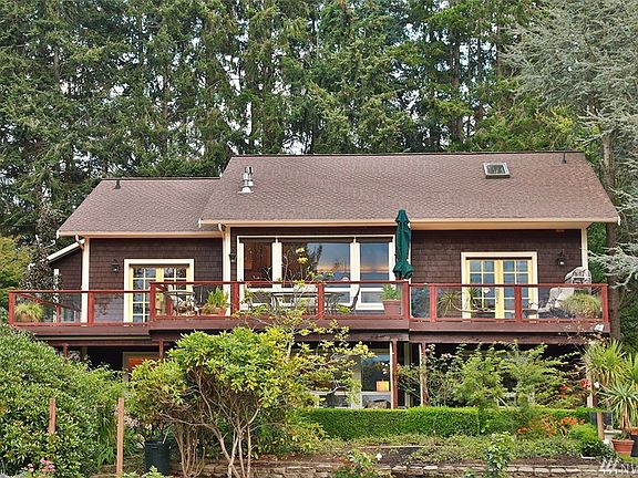 Spectacular canvas w/westerly views over the harbor, majestic sunsets surrounded by enchanted gardens sits this lovely custom home. The epitome of casual elegance features: main floor view master w/fireplace, 2nd master w/separate entrance, wide plank pine floors, bedrooms on lower level + office, mini kitchen, cozy family room & more! Delightful kitchen for any good cook/entertainer, new decks, fenced veg garden, greenhouse, chicken coop, pond & x-large shop w/bath & laundry.