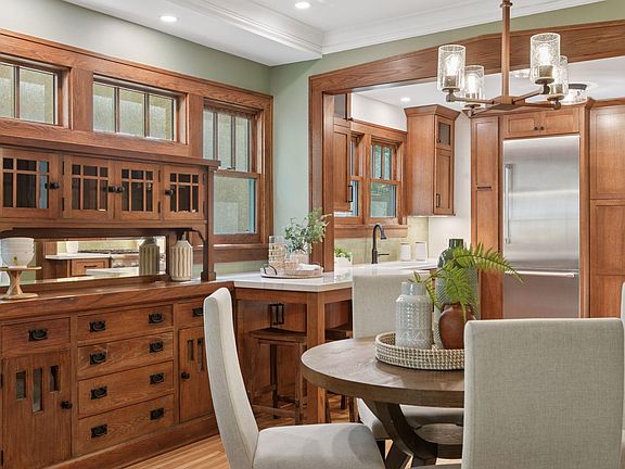 Beautiful original woodwork, a built-in buffet, and wing bookcases frame the living room fireplace, adding to the home’s classic Craftsman charm. Ample storage in the utility and laundry rooms complements the flexible lower-level space.