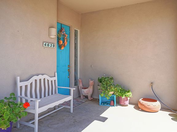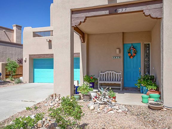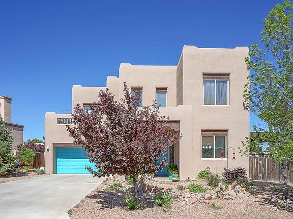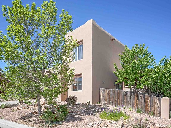 6K PRICE DROP!! 2,030+/- square feet of living space and move-in ready! First floor has 10' ceilings with exposed beams and ceramic tile floors. An open concept floor plan, with living and dining spaces separated by a fireplace. The kitchen is large and cheerful, all appliances included and all are 2 years old. It is separated from dining room by a granite topped breakfast bar. Opening with sliders from the dining room is an enclosed outdoor dining space with stucco walls, brick flooring and paths, and grill area. The large first floor laundry room opens to the landscaped back yard. Plenty of storage can be found in a large closet under the oak stairs. Up the solid oak and tile staircase, the second floor has 9' ceilings and an oak hall way. There are three carpeted bedrooms and two full baths with ceramic tile floors. The en suite master has an incredible view of the Sangre de Christos which can even be seen from the shower!! A large bonus room/studio over the garage likewise has wonderful mountain views. There is an L-shaped deck off the upper hall with excellent sunset views of Jemez, Ortiz and Sandia Mountains, super for night sky viewing! The yard fully desert landscaped, and has a drip irrigation system on a timer.