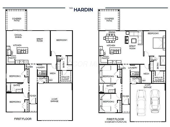 This thoughtfully designed one-level home features three bedrooms and two full bathrooms. The open concept great room looks to a spacious kitchen with stylish cabinetry, a built-in island, stainless steel appliances, hard surface counters and a corner walk-in pantry. The primary bedroom boasts a private ensuite bathroom with double vanities and a roomy walk-in closet. Enjoy peaceful summer evenings on the covered rear patio, perfect for relaxing and making the most of your outdoor space.