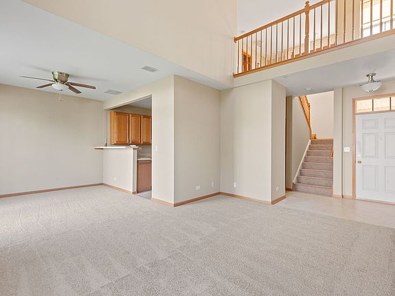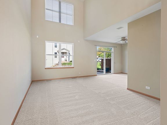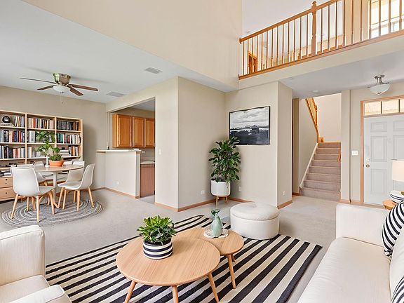 From the private covered front porch entry this lovely, clean upgraded & well-maintained townhome is move in ready. New or newer: Newly installed neutral carpet, Microwave 11/24, water heater 2024, furnace and AC 2023, Driveway 2023 (blacktopped 9/4/25), roof 2019 and stove 2018. Up dated and upgraded lighting package includes ceiling fans, recessed lighting and tasteful chandeliers. Volume ceiling in living room and master; 9' first floor ceilings; separate dining room, honey oak cabinets, 42" uppers, breakfast bar & all stainless steel appliances. 6 panel honey oak doors, trim and railings on stairs and loft. Master has dressing area, double closets & spacious bath with double sinks and updated flooring. Custom blinds. The 2 car garage is insulated, has built-ins, and flooring above garage ceiling for additional storage. Ample closets, conveniently arranged master bath. The lovely rear patio is nestled in a perennial gardens & overlooks park like common area. Convenient location, close to children's playground, shopping, Rt 20 & Rt 59, yet very private & quiet. Beautifully maintained. All you need to do here is move in & enjoy.