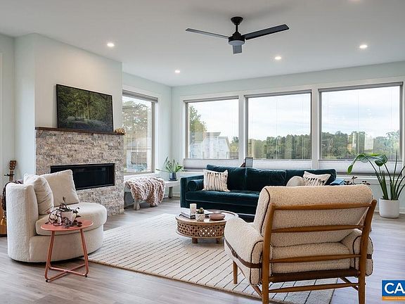 This stunning custom contemporary in Lochlyn Hill provides one of the most sought-after features in the neighborhood: breathtaking, unobstructed views of Meadowcreek Golf Course & Carter's Mountain. The oversized windows throughout the home ensure that these lovely views are always in sight, while the Clear View window tinting enhances both energy efficiency & privacy. This premier lot is located directly across from neighborhood common area protecting the views across the golf course & Pen Park. Style meets function in this open floor plan w/ high ceilings, wrap around screen porch & roof top deck, quartz counters, custom closet systems, top-down/bottom-up window shades, KitchenAid appliances & fireplace w/ stone surround. Incredibly central location minutes to Downtown Charlottesville & UVA w/ direct access to the Rivanna Trail. This eco-friendly community's amenities include: sidewalks, fire pit, pavilion, play area & pollinator park. Built in 2021, home is like-new & move-in ready.