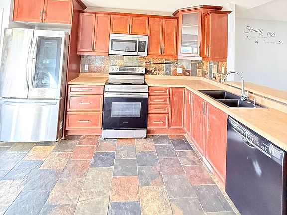 Granite sinkSlate flooringStylish backsplashNatural lightLarge deckFully fenced backyard