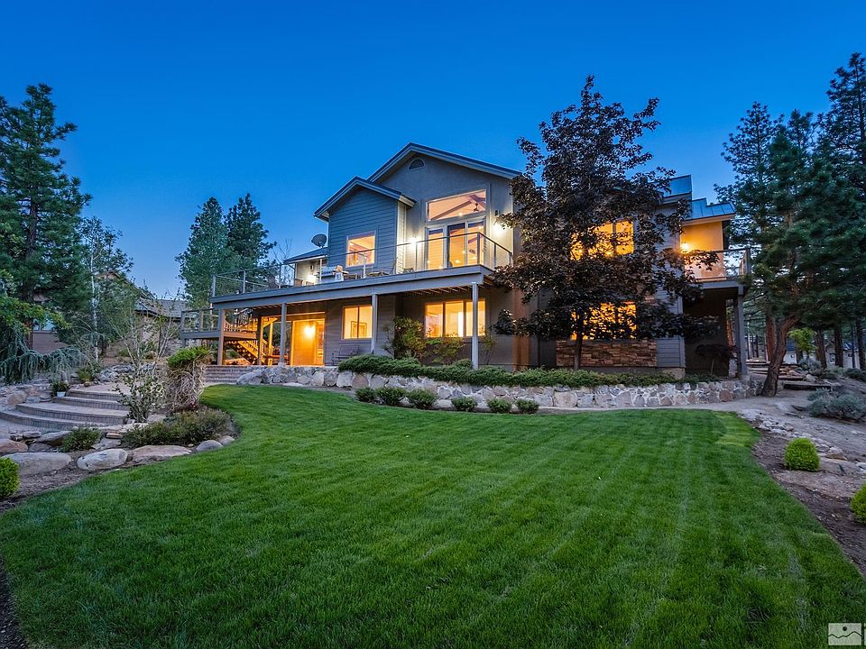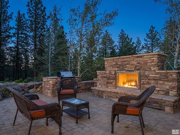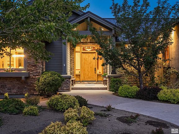 Welcome to your Mountain Sanctuary located in the exclusive area of St. James’s Village, nestled in the forests and mountains surrounding Lake Tahoe. This enclave of homes is a 24/7 gated community with large acre lots, lake and mountain views, open spaces, and miles of walking/hiking trails along Brown’s Creek. Away from the sounds and lights of the city, North and South gated entrances provide 20 minute access to downtown Reno, Carson City, This custom-built craftsman style home boasts superb quality and rich wood finishes. The home features 5 bedrooms all suites, with master suite and guest suite on main level, 4 baths and 2 half baths and a 4-car garage, all set in a treed, private, serene setting. A massive, beautiful alder front door invites you into the home filled with light and views. On the main level, is a great room that opens to a deck that spans the back of the house. This room impresses with a high vaulted ceiling, floor to ceiling gas log fireplace with an artistic “Mt. Rose“ stone etching, rich woods and tile flooring. The kitchen is a chef’s delight with granite countertops everywhere, fine appliances, two sinks and beautiful alder wood custom cabinets. The formal dining room is positioned near the kitchen and features hickory flooring and an elegant, lighted, coffered ceiling. The main level also includes a large master suite with a fireplace and a private deck. The spa bathroom has double sinks, a whirlpool tub complete with fireplace for cozy soak time, a separate steam shower with tiled bench and multiple shower head options. The oversized walk-in closet includes his and her entrances and a complete make up vanity with sink and large lighted professional make up mirror. A stunning large office has a vaulted ceiling, rich hickory flooring and hickory floor to ceiling bookshelves and cabinets. Large picture windows on two walls provide a setting where anyone would want to work or relax. A beautifully decorated guest half bath, large guest bedroom with ensuite full bath with shower and a large laundry room complete the main floor. The laundry room opens to a 1400 sf 4 car garage with custom workbench and built in cabinets for storage. A Telsa charging station is installed. A large, fenced 1800 sq ft dog run complete with a rock doggy cave is off the garage. Downstairs offers three bedrooms, one ensuite with whirlpool tub and shower and large walk-in closet. The other two bedrooms have ensuite sink and vanity and share a “Jack and Jill” toilet and whirlpool tub/shower. The lower-level floor is finished with stained, stamped concrete known for it’s strength, durability and easy maintenance making it the ideal flooring for kids, pets, and game room fun. A second laundry room complete with doggy shower opens to a large exercise room. A large recreation room is the perfect place for a game of pool or to curl up with a book from the floor to ceiling hickory bookshelves. A bar area with refrigerator/freezer provides the refreshments! The rec room opens to a custom paver patio with built-in bbq and gas fireplace. It’s the perfect place to enjoy hours and hours of fun and entertainment with family and friends. But wait, how about your own theater with top end equipment including 105’ screen, a Sony projector, Denon Receiver with 6 channel surround sound driving Atlantic Technology speakers. Seven Lay Z Boy leather recliners have sound shakers under the feet to add to your movie watching experience. If you need or desire a wine room this home offers a naturally cooled fully finished and tiled space as well. The home is technologically up to date. A burglar alarm system from Systems of Nevada is installed. All rooms are wired with Ethernet CAT 5 and coax to provide easy connection of Internet devices now and in the future. A three zone mesh wireless installation provides excellent wireless coverage everywhere in the home. All wiring terminates in a “home run” equipment room adjacent to the t
