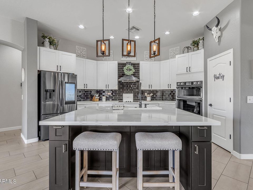 Stunning home w/ modern touches, white shaker cabinets, oversized island, quartz countertops, black subway tile backsplash, double wall oven, & black stainless-steel appliances. Enjoy a movie in the finished basement while you serve your guests at the full wet bar, or work out in the private gym. Master bedroom split from the large two bedrooms on the main level. The backyard paradise features a pool, rock waterfall, gas fireplace, & sports court. Features: Plantation shutters, surround sound on each level, updated fans/fixtures, Tempur-Pedic foam pad, white subway tile showers, porcelain tile, epoxy flooring in 3 car garage, EV plug, commercial misting system, & 3 Lennox AC's installed in 2023. A perfect blend of luxury & functionality. Spacious corner lot w/ N/S exposure.