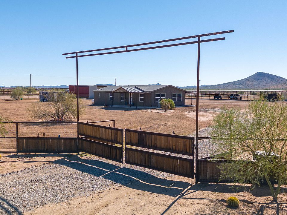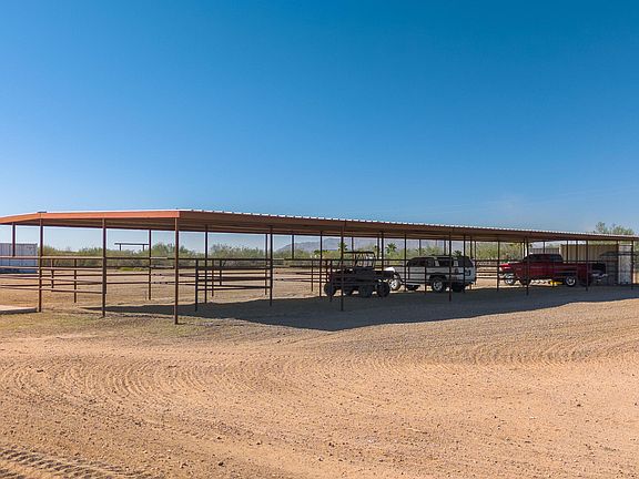 A true cowboy's dream, this Wickenburg property sits on 5 fully fenced acres with no-climb perimeter fencing and plenty of room to ride and expand. Featuring six covered 20' x 20' stalls with water and power, 50 amp and 30 amp plug-ins, and a water line running to the back of the property, it's perfectly set up for horses. There's also space to build your own arena, along with a 25' x 75' covered storage area, hay barn, and wash rack. The 4-bedroom, 2-bath home offers an open kitchen with quartz counters, a spacious living room showcasing beautiful mountain views, and a large primary suite with a full bath. Enjoy Arizona's warm winters from the comfort of the covered patios — the perfect blend of ranch living and modern comfort.
