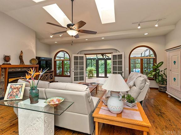 Step into the luxury of Mediterranean living in this captivating Fallbrook residence nestled off the scenic drive of Sleeping Indian. Beyond the gated entry, discover a stunning fusion of modern elegance and natural beauty. Succulent gardens guide you towards stained-glass entry doors, framing a view of Sleeping Indian, the pool, spa, and westward vistas from the courtyard. Inside, the home boasts high ceilings, skylights, a mesmerizing fireplace, arched entryways, and French doors leading to an enclosed back patio. Dual primary suites, each with a private balcony, offer a unique touch. An additional bedroom, four bathrooms, and engineered wood floors complement the interiors. The gourmet kitchen, equipped with electric appliances, features a central cooktop island, breakfast bar seating, glass front cabinets, stainless appliances, and granite countertops. French doors lead to a spacious trex deck with an outdoor BBQ area. Owned solar panels power the home as well as an additional solar system for the pool and spa and a home water filtration system. Set on 1.5 lush acres, the property boasts raised garden beds, family fruit trees, avocado trees, and majestic coral trees providing shade and privacy. There is a shed, tarp/canopy cover, workshop area (approx. 550 sq. ft.) off the garage with heat & air adding versatility to this tranquil retreat. Don't miss the chance to call this Mediterranean beauty your home in Fallbrook, CA. Note: All living area is on one level however, there are steps leading from garage to house/kitchen area and from driveway entry to front door.