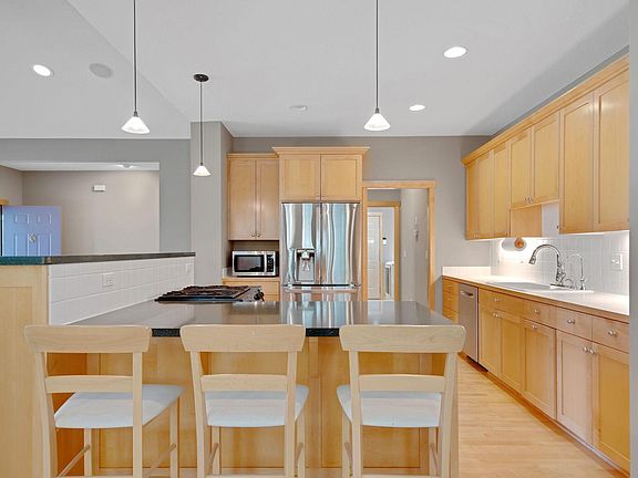 Welcome to this inviting 3-bedroom rambler that combines comfort and function in a beautiful setting surrounded by mature trees. Inside, you’ll find hardwood floors, panel doors, and an open floor plan designed for everyday living and entertaining. The kitchen shines with stainless steel appliances, a gas range, tile backsplash, recessed and pendant lighting, and flows seamlessly into the living areas. The main level also offers a built-in entertainment center, laundry, and a three-season porch that brings the outdoors in year-round.