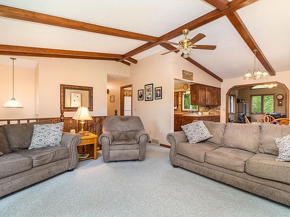 Wonderful 4 bedroom 2 bath home on 2 Acre wooded lot, concrete & asphalt driveway and tar road, large 4 season porch with gas wood stove, heated garage & epoxy floor, floor drain, 3 bedrooms on main level, open floor plan, deck, patio, 30x50 heated shed with concrete floor & stereo, firepit, tile bathroom floor, newer roof, apple trees & raspberry bushes. Ready to move right in and enjoy, come see!!