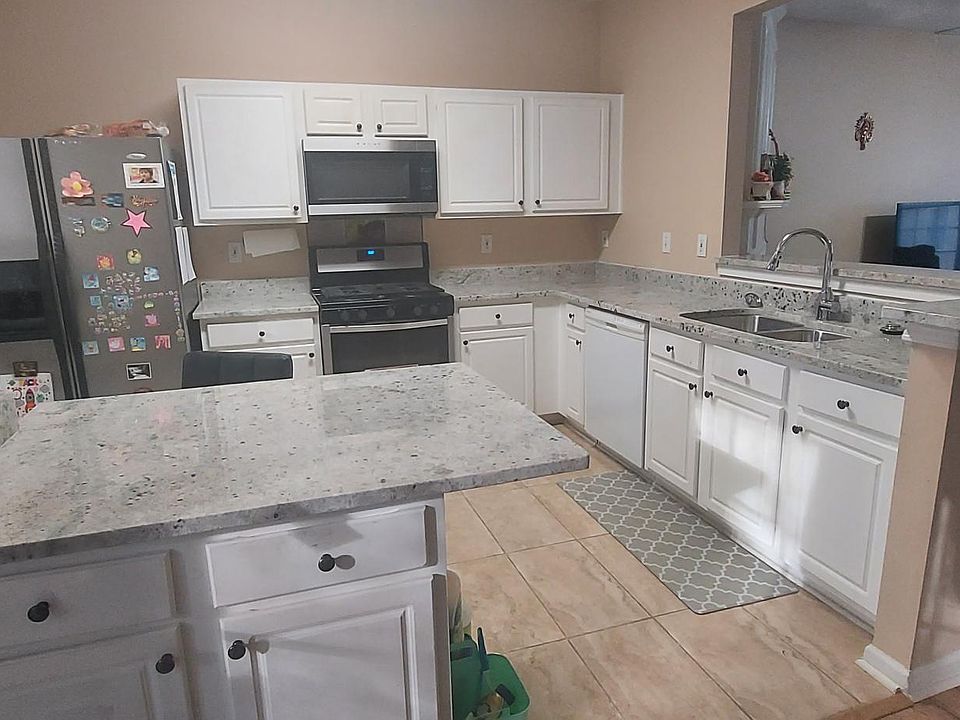 White kitchenStainless steel gas rangeQuiet neighborhoodNew granite counter top