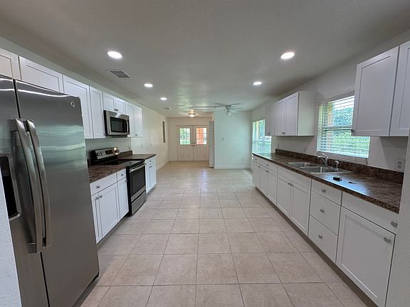 New appliancesUtility sinkSpacious kitchenTile flooringDining areaCovered patioStainless steel appliances