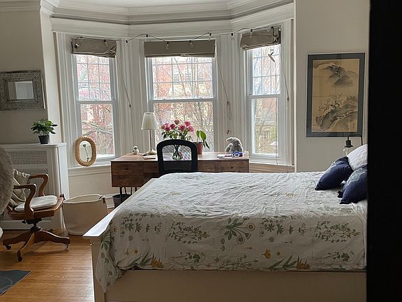 Beautiful Spacious bedroom on the second floor. It has a bay window, it is fully furnished with a full size bed, chest of drawers, book cases, a desk and a closet. hree story historic house in University city West Philly.
