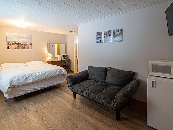 Room with 2 bedrooms, first room has a Queen bed and a sofa that rolls out to a twin bed, second room has a Queen bed, closet, night stand. Refrigerator, microwave and coffee machine. Newly remodeled rooms. The floors in the bathroom and bedrooms is Vinyl Floor Planking, light gray walls and art on the walls. A walk in shower no tub