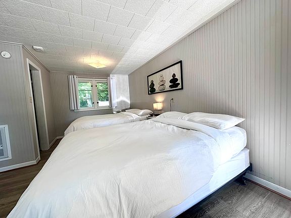 Room with 2 Queen beds, sofa couch that rolls out to a full-size bed, refrigerator, microwave and coffee machine. Walk in shower, no tub. The floors in the bathroom and bedroom are Vinyl Floor Planking, light gray walls and art on the walls.