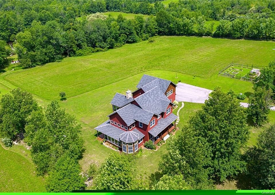 A bucolic farm to table paradise, 90 minutes from New York City. Custom built NYSERDA, ENERGY STAR, geothermal home on 16 acres of meadows and woods with beautiful rural views from every window. The back opens to a field sloping down to a private, stocked lake for fishing and recreation. Architect's original renderings include the option of a swimming pool. A pool house with solar panels would complement the geothermal, passive solar house with enough energy for a near zero carbon footprint. Three porches and decks, hardscape patio at the lake and numerous groomed paths to walk through fields and woods. Two organic vegetable gardens and outbuildings with usable space, perfect for an artist/exercise studio, billiards, playroom, etc. Spacious master suite features two walk-in closets, clawfoot tub and study/office. The guest wing includes three bedrooms, two which share a full bath, the third with en suite full bath. Two glassed-in sitting rooms (one upstairs, one down) each have a two-sided fireplace. Main floor offers fabulous chef's kitchen-dining-great room, passive solar sunrooms, library, music room, two powder rooms and a shower. Green construction includes blown foam wall and ceiling insulation, rigid foam insulation under foundation, Series 400 Andersen windows and doors and reclaimed wood flooring. High ceilings on all levels and 78 windows and glass doors create an expansive, open, contemporary farmhouse. Wood, stone and tile flooring and 10' poured basement walls. Included in the acreage is a building site, perfect for guest house or income property. The surrounding countryside is made up of farms and small towns. Minutes from the house are golf courses, horseback riding and a park with children's playground, baseball field, horseshoes, basketball and more. Easy day trips include the internationally acclaimed art centers Storm King, DIA:Beacon and Bethel Woods Center for the Arts. Also nearby are Woodstock, the Delaware Water Gap, Mohonk Mountain House, Appalachian Trail, Bear Mountain and Harriman State Parks, Woodbury Outlets, Lego Land, West Point, wineries, breweries, distilleries, orchards, farm stands and a 24-hour honor system farm store stocked with local beef, eggs, and dairy. Zoned agricultural/residential, the property allows for Bed & Breakfasts, expanded crops, farm animals and horses.