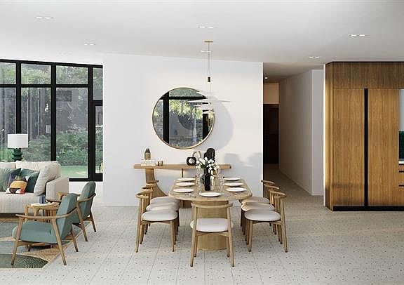 Immense backyardOutdoor living spaceFull laundry roomStriking angled rooflinesExpansive geometric formsPrivate tropical oasisNatural light
