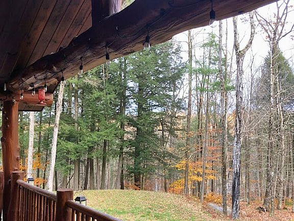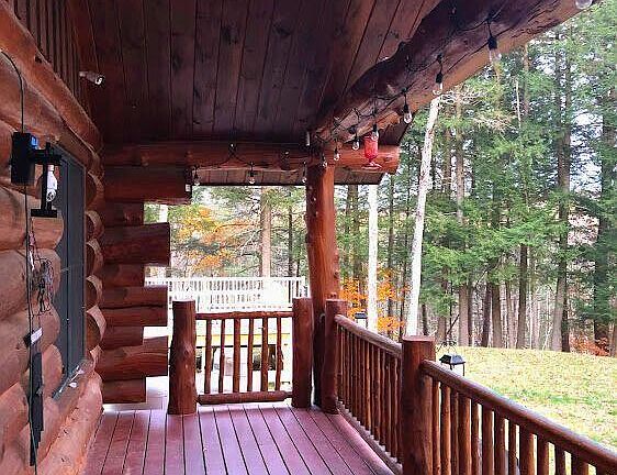 Custom log cabinOutdoor fireplaceLandscaped lawnExposed beamsHardwood floorsAbove-ground pool with deck