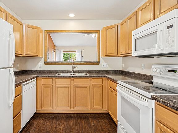 Move in ready zero lot line home features 2 bedrooms and 2 baths - dine in kitchen with plenty of cabinets and countertop space pass through window to the living room for convenience- electric stove, refrigerator, built in microwave-spacious living room with vaulted ceiling and slider access to private deck and backyard -Lovely perennial beds - Garden shed for extra storage - Primary suite with private bath, two full closets and backyard view- Second bedroom has a backyard view too - Main level laundry - Full unfinished basement - two car attached garage with refrigerator-Shared driveway was resurfaced last year!